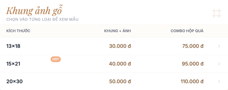 Kích thước phổ biến: 10×15 – 13×18 – 15×21 – 20×30 – 30×45 – 40×60, và in theo yêu cầu.